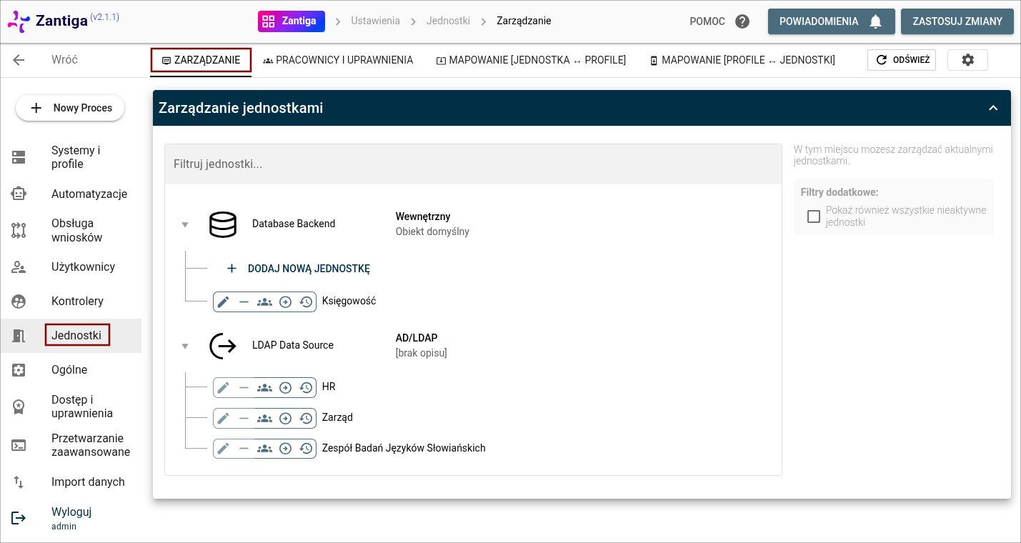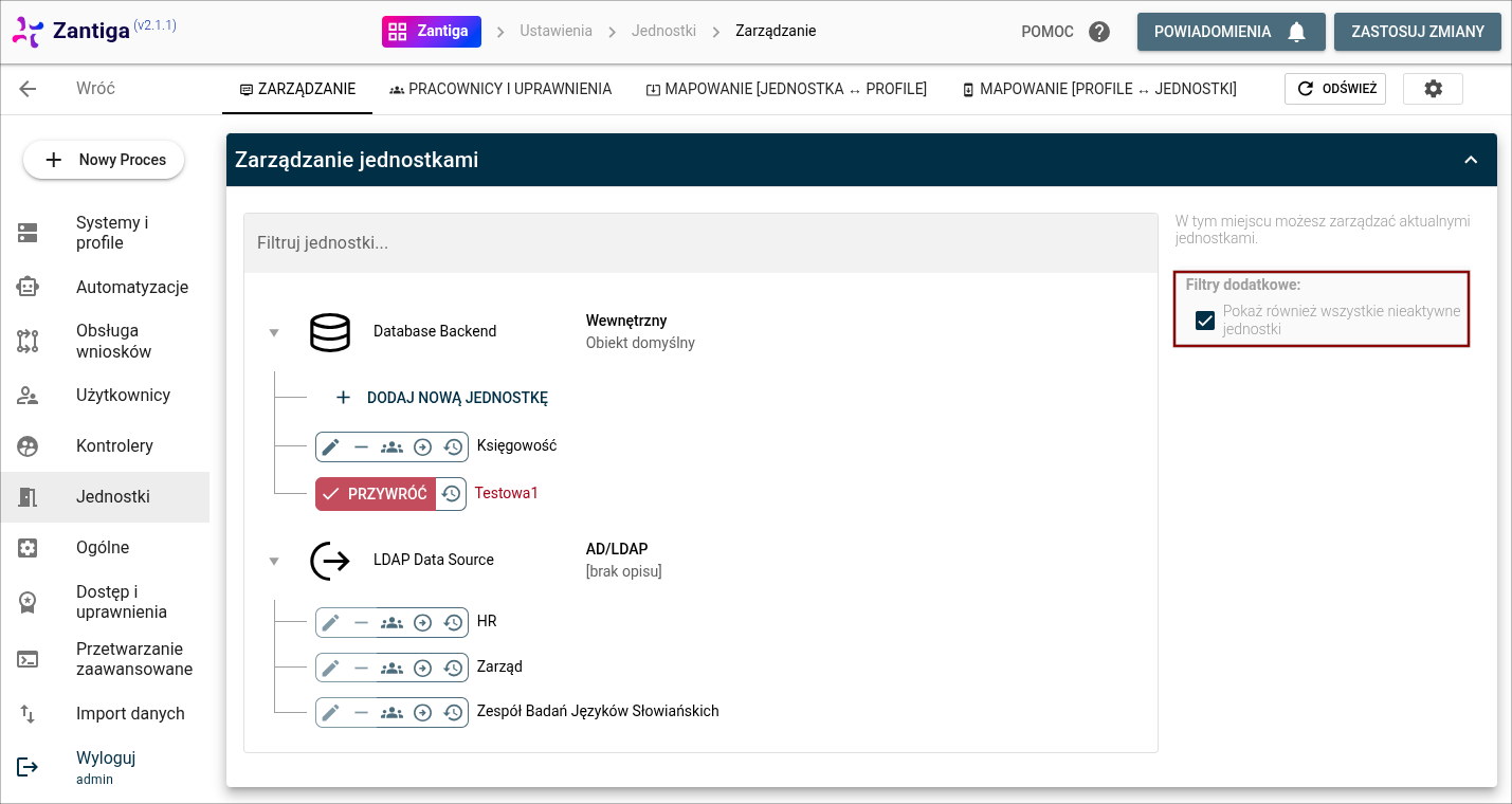 *Jednostka dezaktywowana znika z widoczności głównej listy. Nie ma możliwości całkowitego usunięcia jednostki. By ponownie aktywować jednostkę należy zaznaczyć filtr "Pokaż również nieaktywne jednostki" po prawej stronie. Następnie kliknąć "Przywróć"