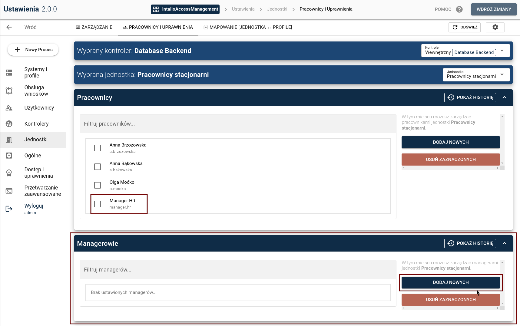 Managerem w jednostce musi być osoba wcześniej dodana to niej jako zwykły pracownik. Następnie należy nadać jej uprawnienia managera, dodając ją w sekcji "Managerowie".