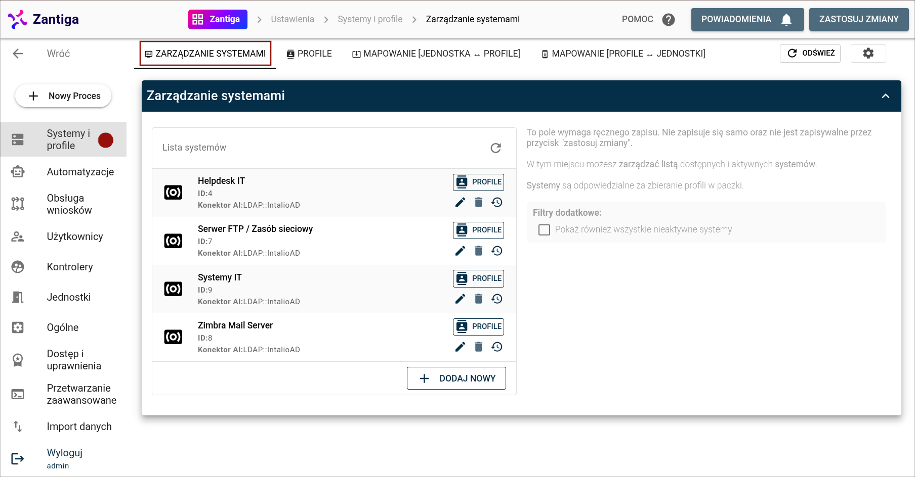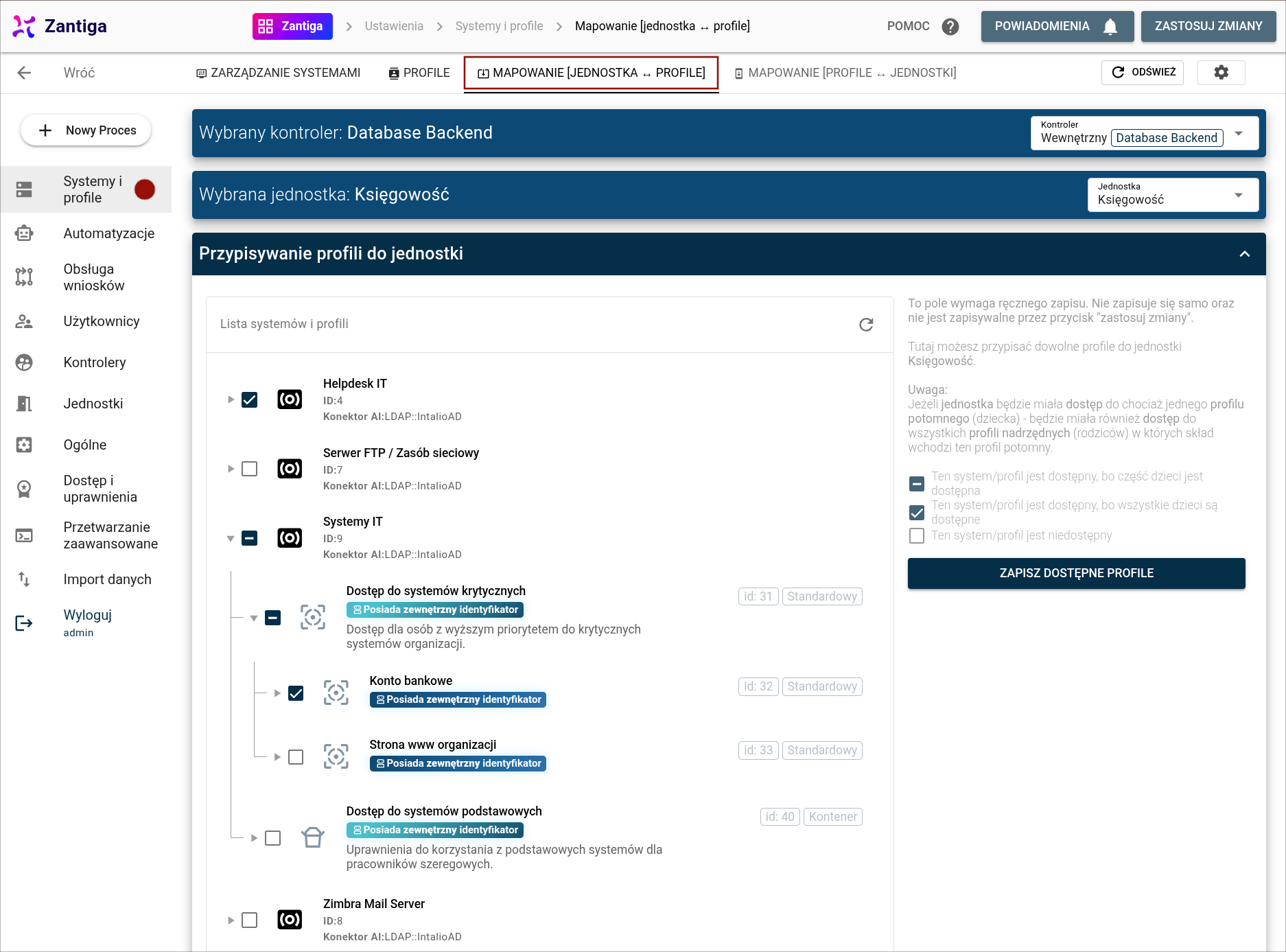 Dostępy: sekcja definiowania jacy użytkownicy posiadają rolę administratora systemu. Funkcja ta umożliwia dostęp do takich działań jak zarządzanie użytkownikami, rolami czy procesami. Użytkownik, który zawsze jest administratorem to główny administrator systemu (SuperUser).