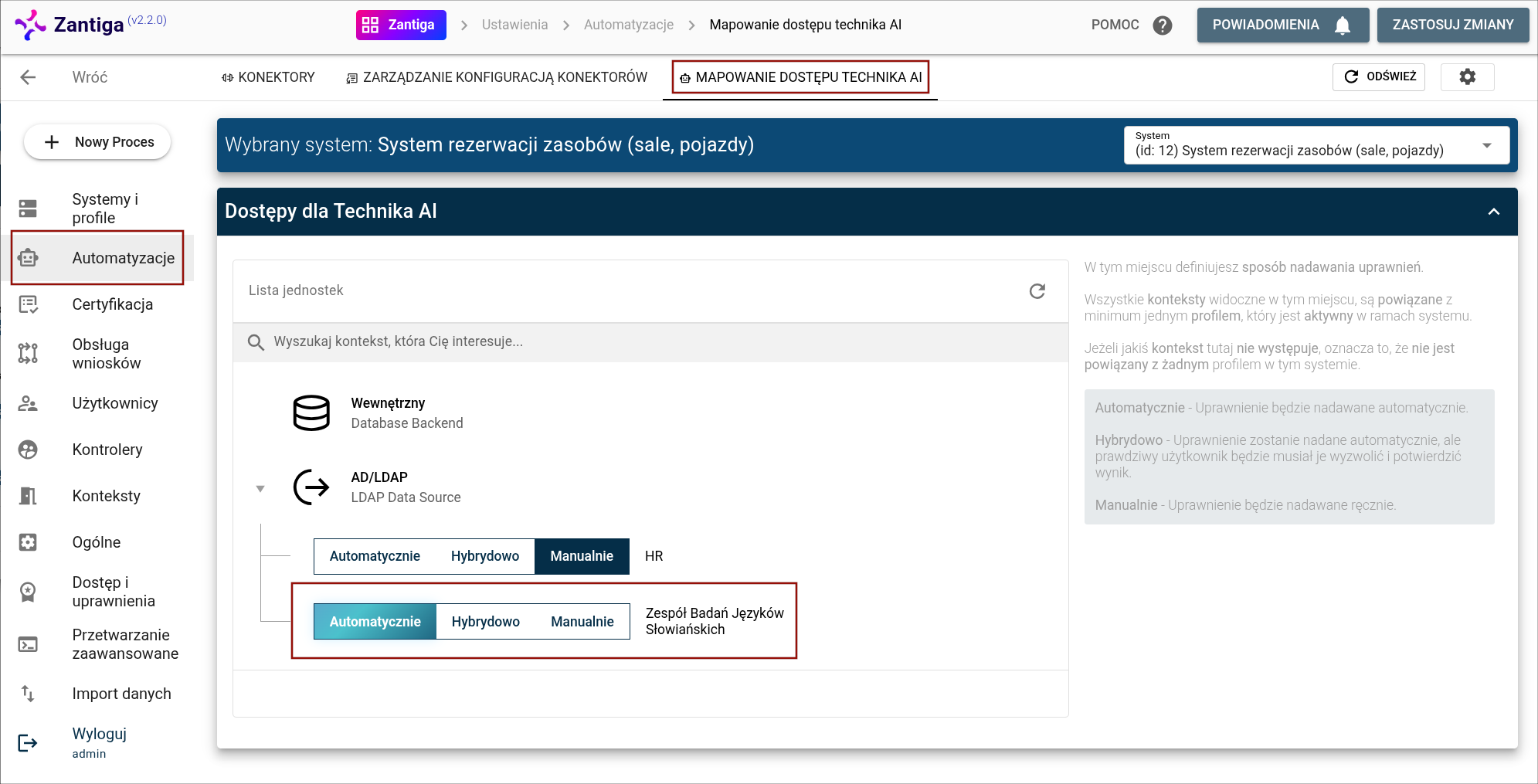 W aktualnej konfiguracji Zantiga, "System rezerwacji zasobów (sale, pojazdy)", działający w kontekście* "Zespół Badań Języków Słowiańskich", jest skonfigurowany do automatycznej realizacji wniosków za pośrednictwem Technika AI.