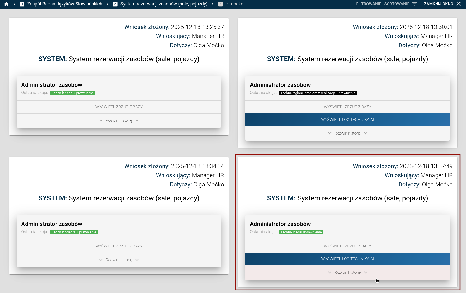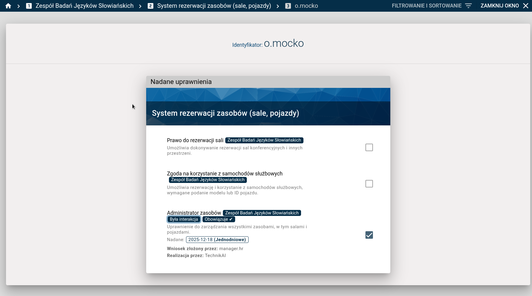 Nadawaliśmy uprawnienie w kontekście "Zespół Badań Języków Słowiańskich" w systemie rezerwacji zasobów dla pani Olgi Moćko. Rejestr wskazuje, iż uprawnienie jest nadane przy użyciu Technika AI.