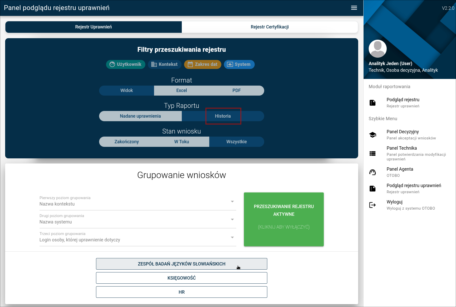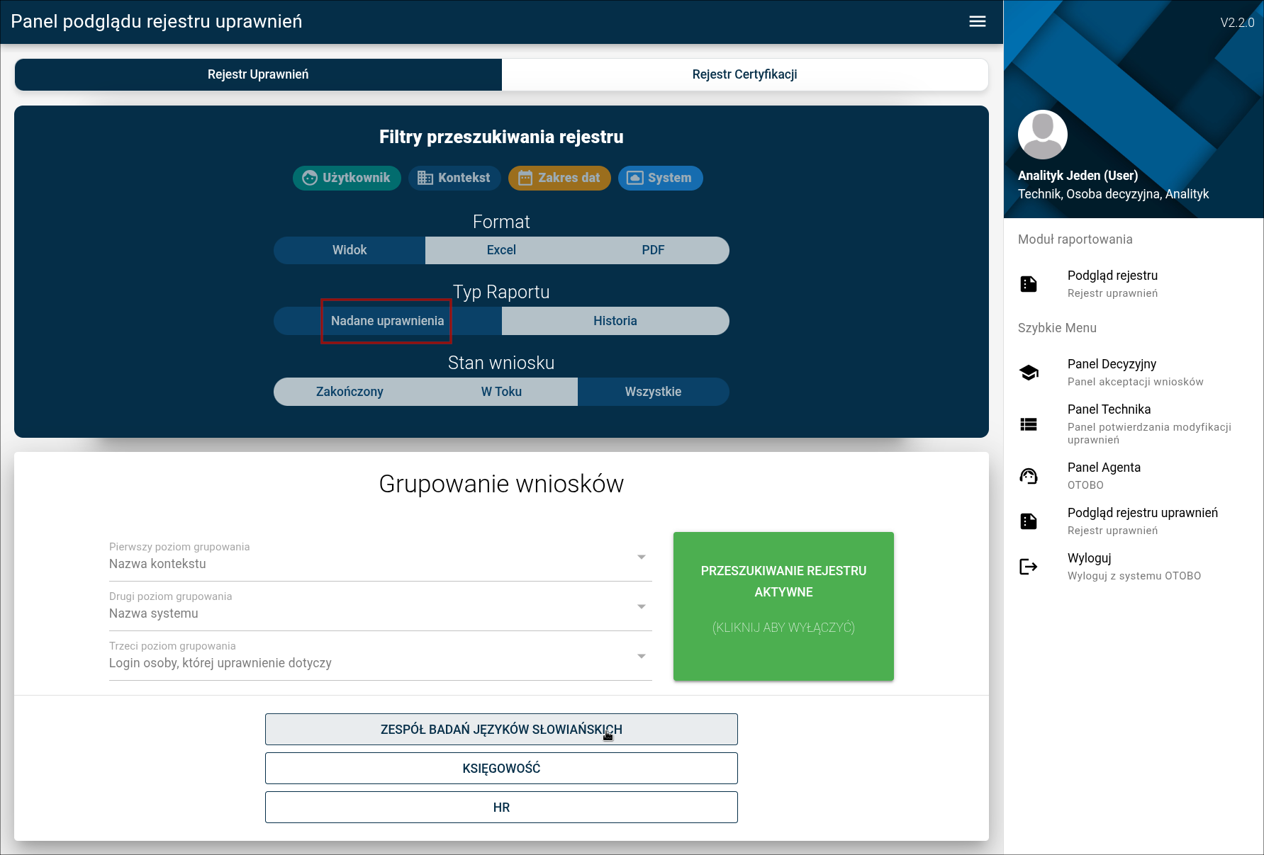 Nadane uprawnienie można podejrzeć w rejestrze poprzez panel analityka logując się danymi dla "analityk".