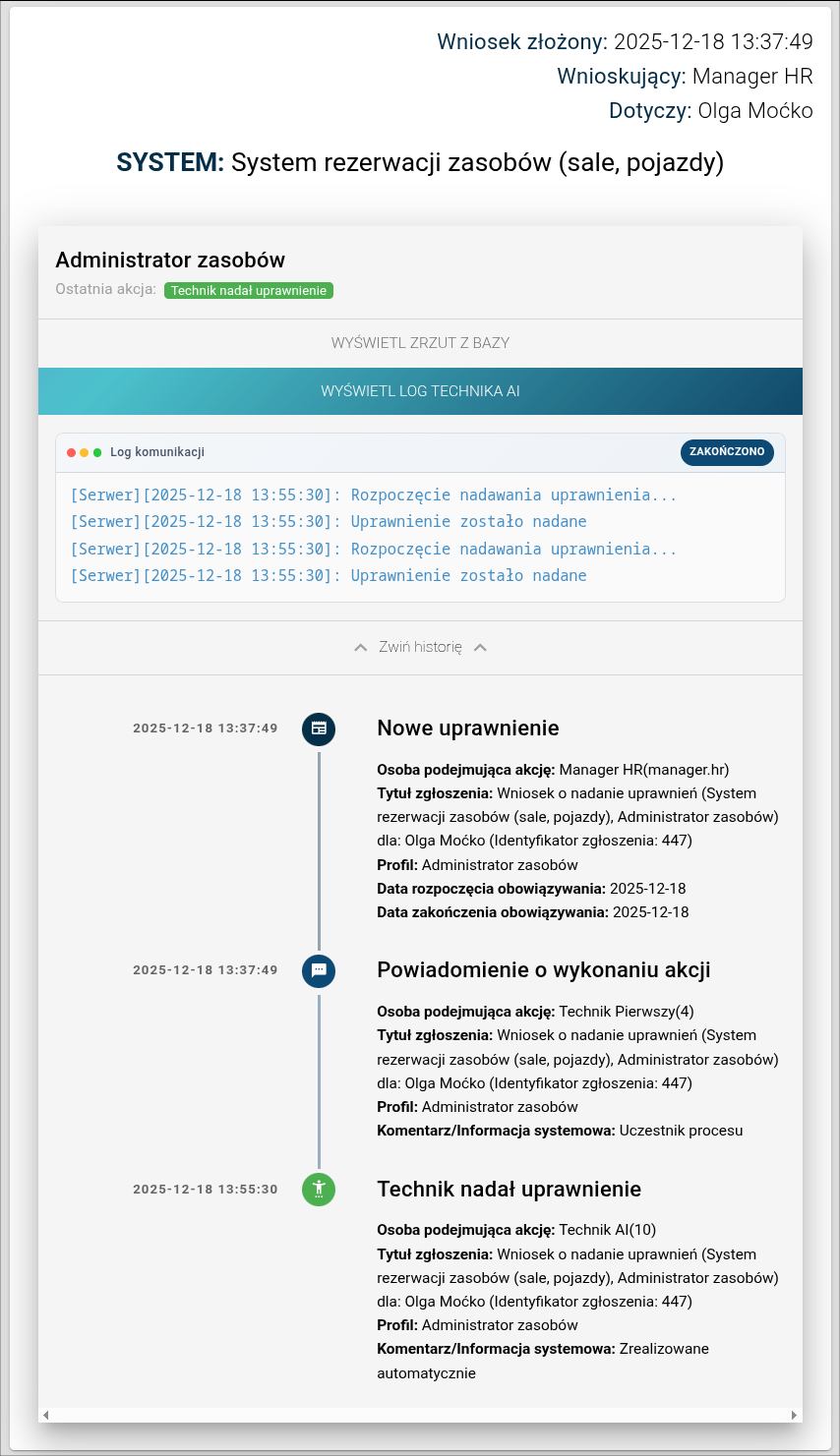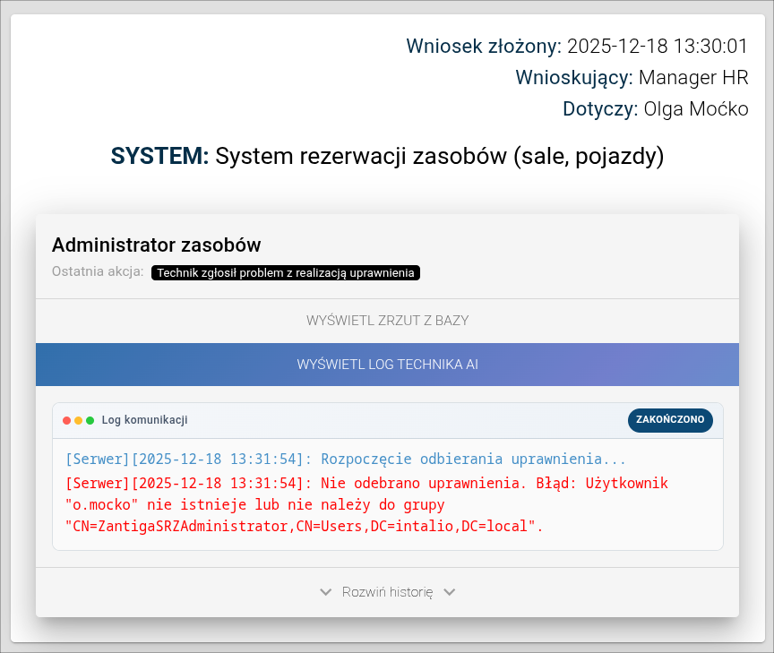 Dodatkowo widoczna jest godzina wykonania operacji przez Technika AI, a w przypadku natrafienia na problem również informacja o błędzie lub niepowodzeniu realizacji.