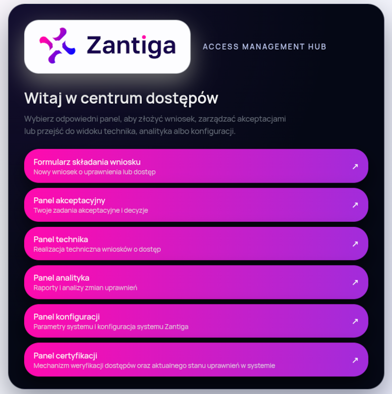 Centrum zarządzania dostępami Zantiga udostępnia przekierowania umożliwiające bezpośredni dostęp do wszystkich głównych paneli systemu. Klient korzysta z Centrum zarządzania dostępami Zantiga w przypadku, gdy chce zalogować się do któregokolwiek z dostępnych paneli systemu. W przypadku tego scenariusza będą to panele: konfiguracji, technika, analityka oraz formularz składania wniosków.