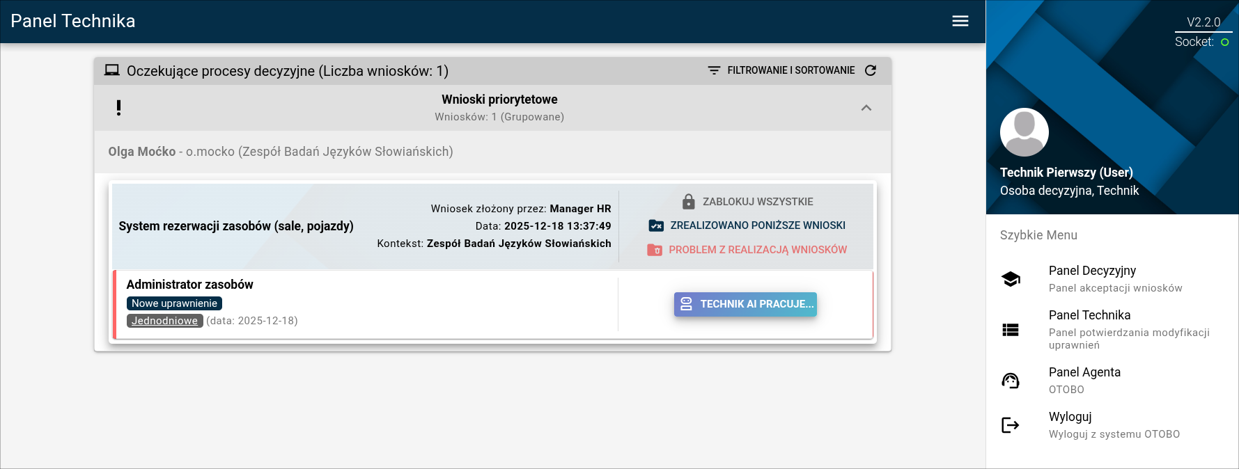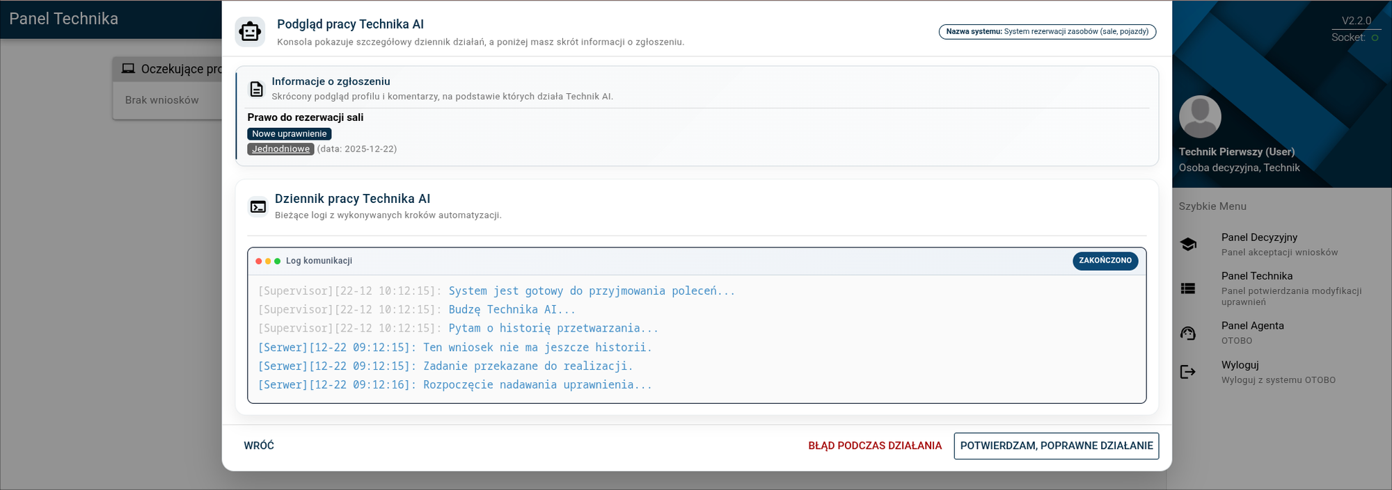 Wysłany wniosek trafia na panel technika. Mechanizm Technika AI automatycznie zrealizuje go o pełnej godzinie. Do tego momentu wniosek będzie widoczny z oznaczeniem "Technik AI pracuje". Wiszący wniosek można podejrzeć logując się na panel technika danymi dla "technik".