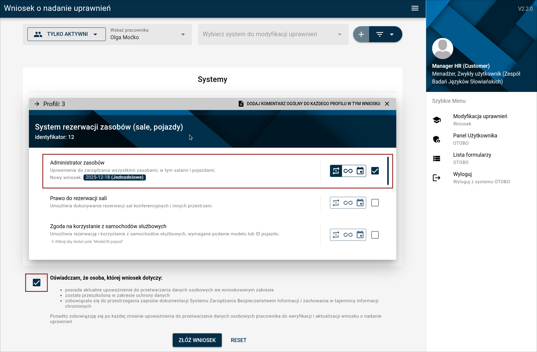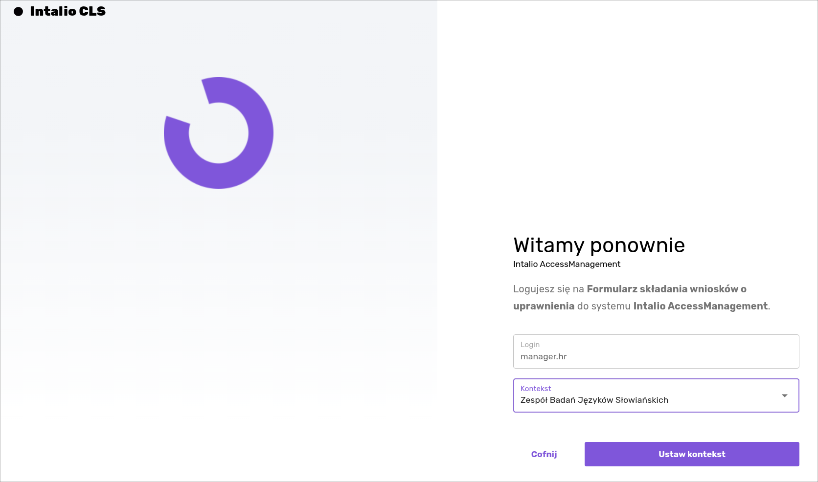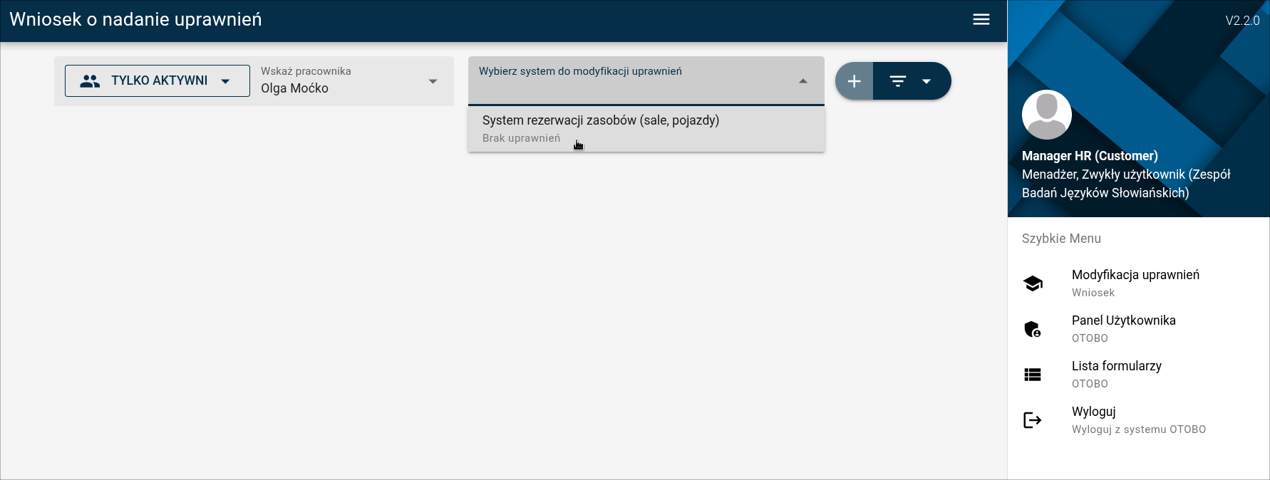 Wejdź poprzez kliknięcie z w zakładkę "Formularz składania wniosków" na panel wysyłania wniosków i zaloguj się udostępnionymi danymi jako "manager.hr" w kontekście "Zespół Badań Języków Słowiańskich"
