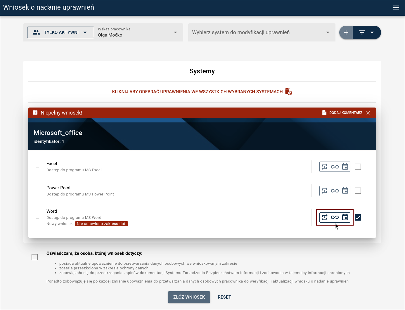 *Dodatkowo program umożliwia priorytetyzację wybranych wniosków. W domyślnej konfiguracji wnioski dotyczące uprawnień jednodniowych są automatycznie klasyfikowane jako priorytetowe i prezentowane na panelach decyzyjnych w dedykowanej zakładce wyświetlającej się jako pierwsza z góry.